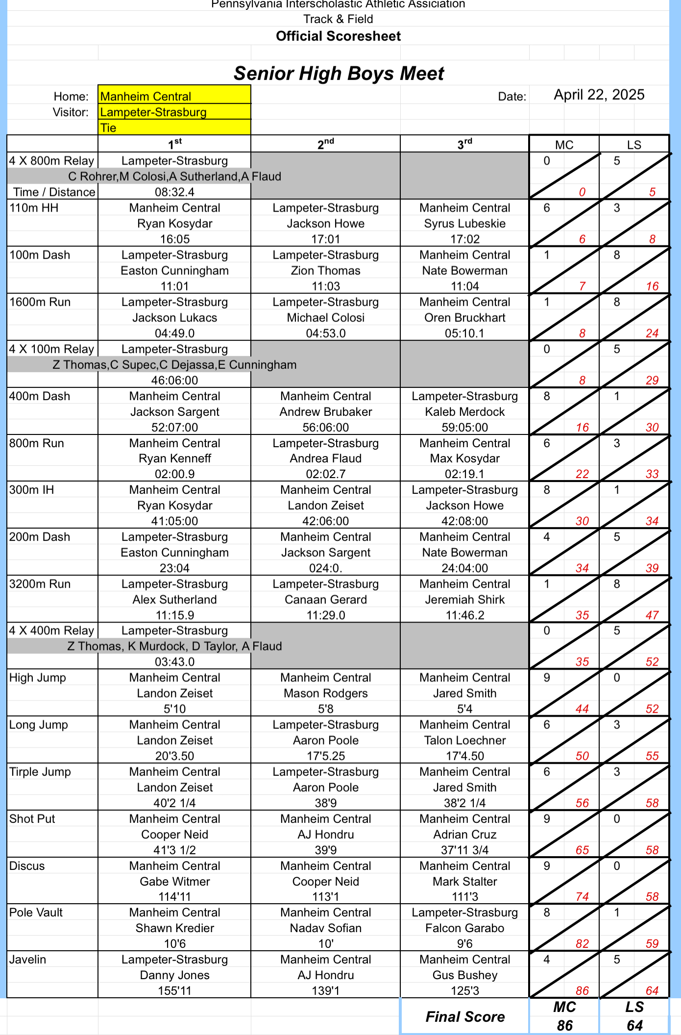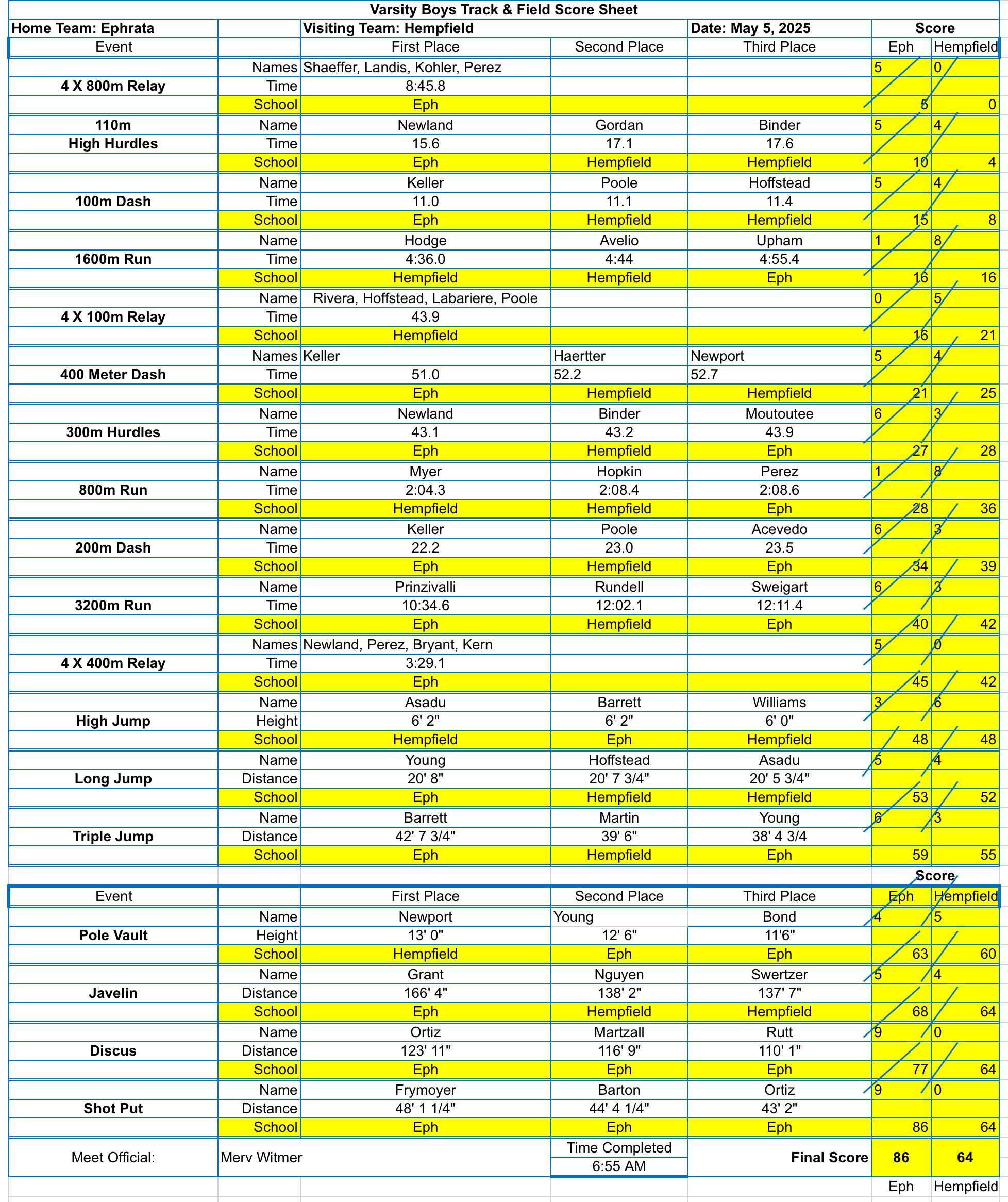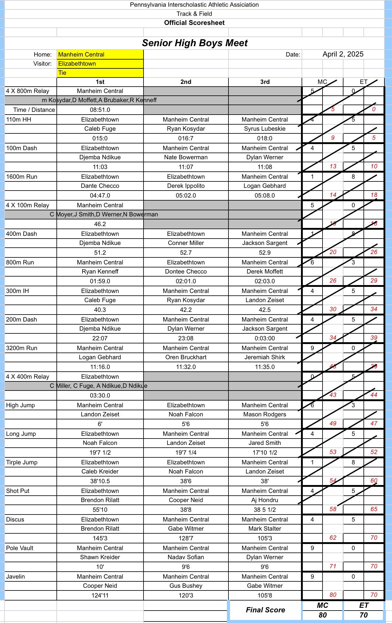 Ephrata @ Manheim Township – Results (partial results due to weather)