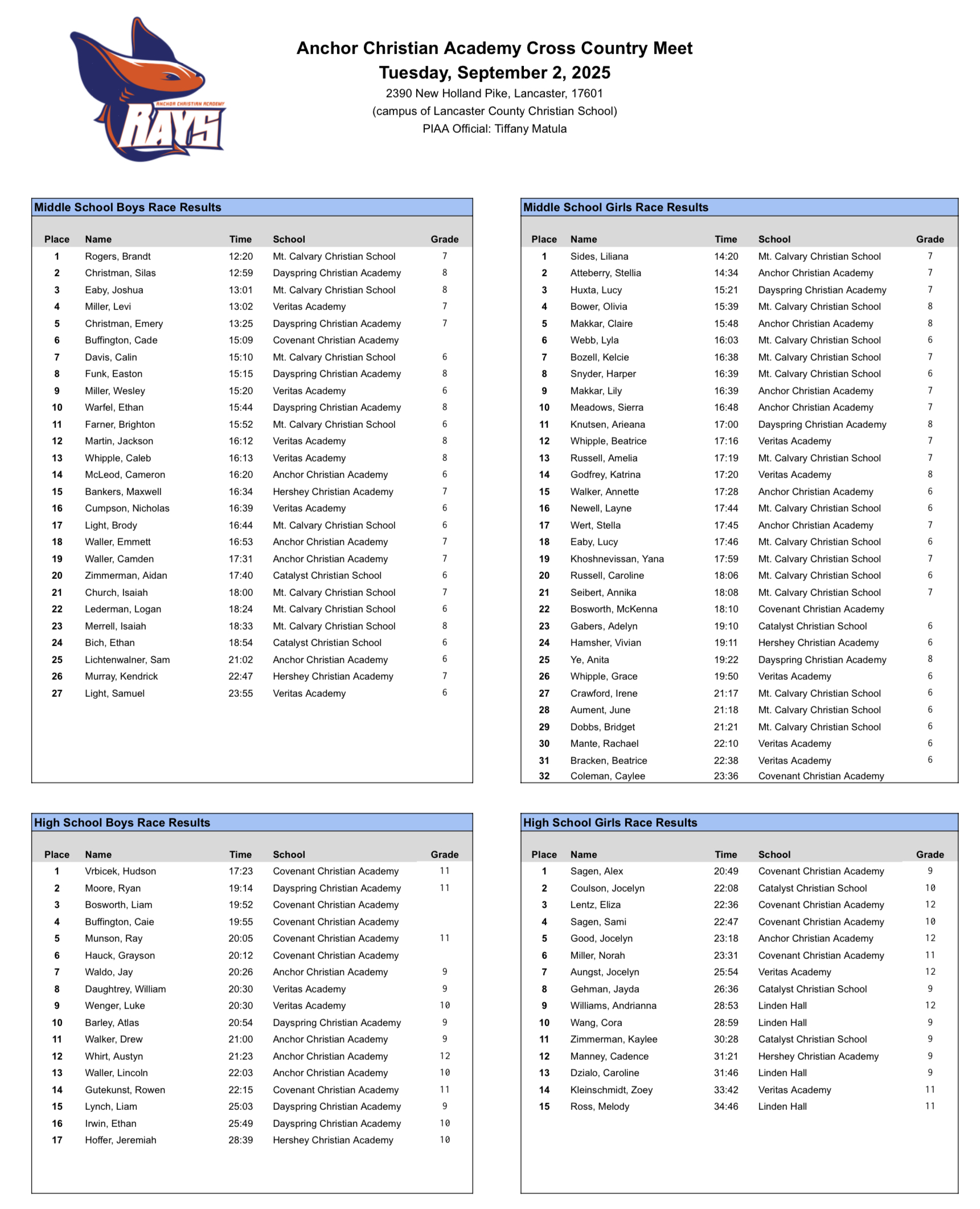 Covenant Christian, Dayspring Academy, Linden Hall, Veritas Academy @ Anchor Christian – Results